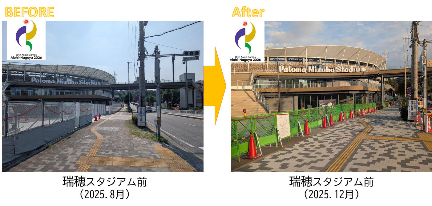 2026年に開催予定のアジア競技大会に向けて整備を進めていた歩道のバリアフリー化について、 瑞穂運動場西~パロマ瑞穂スタジアム付近までのうち、南側歩道のリニューアル工事が完了いたしました。 今回の工事では、老朽化した高木や低木を撤去し、車いすがすれ違うことができるよう、歩道の幅を広げるとともに、 新しいブロック舗装により、滑らかで、つまづきの少ない歩道になりました。 工事にご協力いただきまして、近隣のみなさま、本当にありがとうございました。 なお、引き続き、豊岡通(北側)でも、弊社が歩道のリニューアル工事を行っております。 引き続き、ご協力のほど、よろしくお願いいたします。
